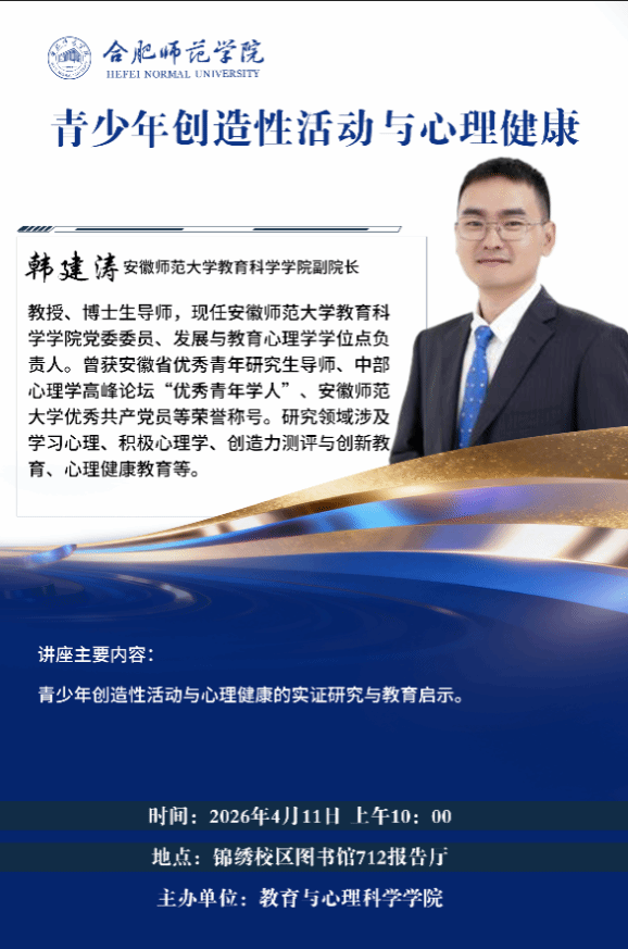 报告人简介:韩建涛,教授、博士生导师,现任安徽师范大学教育科学公司党委委员、副经理、发展与教育心理学学位点负责人。曾获安徽省优秀青年研究生导师、中部心理学高峰论坛“优秀青年学人”、安徽师范大学优秀共产党员等荣誉称号。研究领域涉及学习心理、积极心理学、创造力测评与创新教育、心理健康教育等。