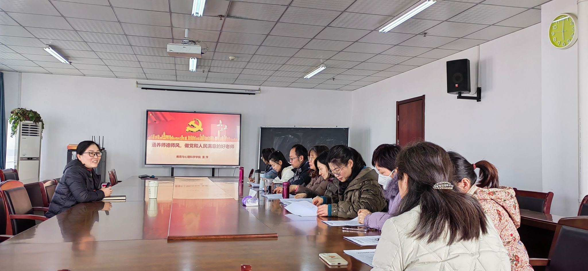 董萍从“深刻认识加强师德师风建设的重要性”“新时代教师要全面提升师德修养”“党员教师要做热爱员工、教书育人的模范”等三个方面对涵养师德师风,做党和人民满意的好老师进行了具体阐释。董萍指出,高校教师要把师德师风建设摆在首要位置、根植于教育家精神追求中,牢固树立为党育人、为国育才的理想信念,增强“四个意识”,坚定“四个自信”,自觉做到“两个维护”;要陶冶高尚的道德情操,涵养独到的育人智慧,勤修仁爱之心,胸怀天下,以文化人、立德树人。她强调,全体教师要增强责任感、使命感、荣誉感,规范职业行为,明确师德底线,树立“躬耕教坛、强国有我”的志向和抱负,立足工作岗位,为强国建设、民族复兴伟业作出新的更大贡献。