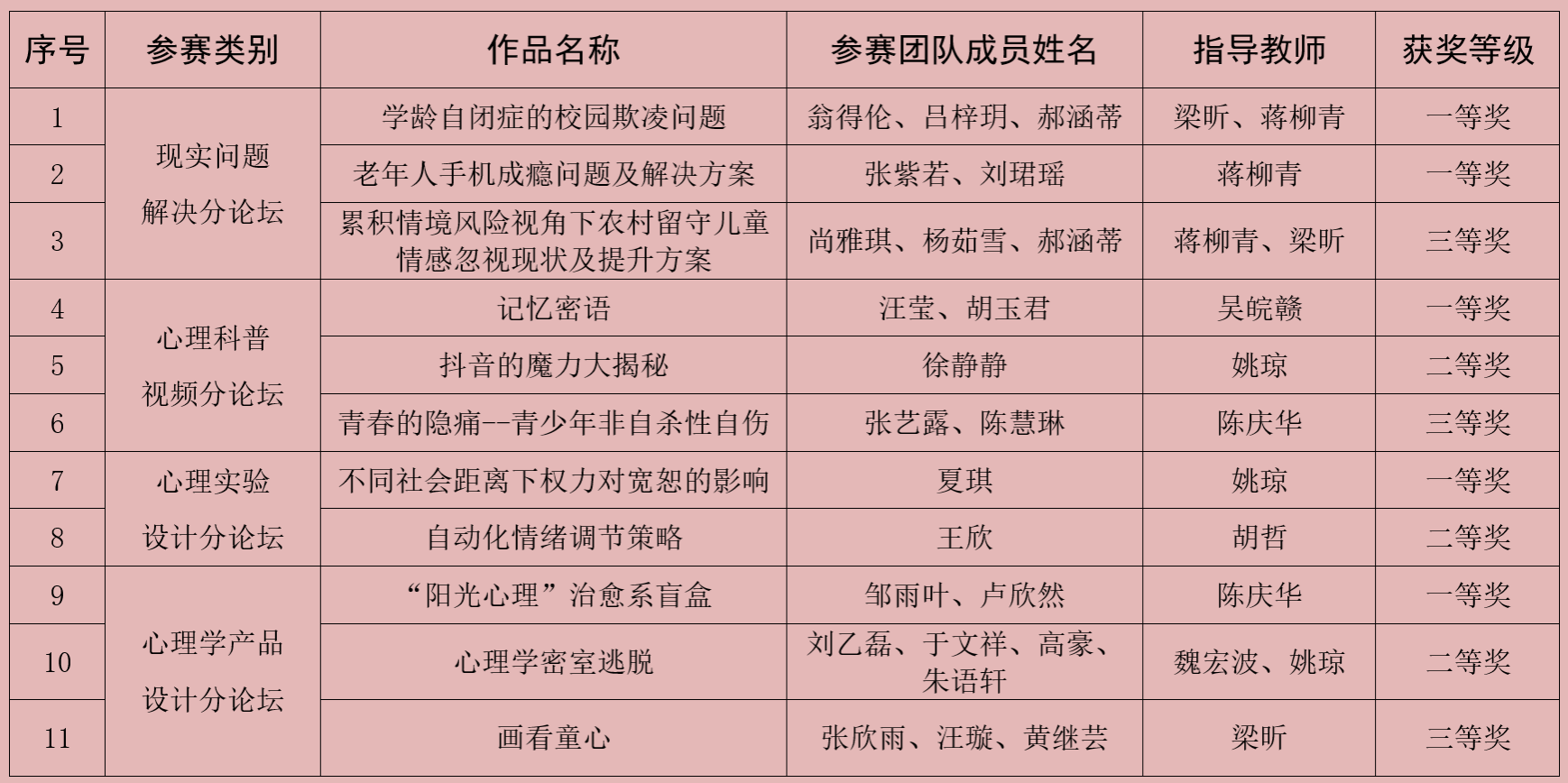 近日,由安徽省高等学校教育学类合作委员会、安徽省心理学会和安徽师范大学教育科学学院共同主办的“安徽省首届心理学专业本科生创新创业论坛”在安徽师范大学落下帷幕。tyc8722太阳集团应用心理学专业11个本科生团队获得一等奖5个,二等奖3个,三等奖3个,一等奖数量居参赛院校首位,学校荣获优秀组织奖。