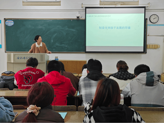 3月25日下午,合肥市望联路幼儿园园长杨慧在锦绣校区博约楼316教室开展“创设支持孩子发展的环境”主题讲座。杨慧指出,幼儿园工作中存在幼儿参与创设程度低、对环节知晓度不高以及主题课程环境少等实际问题,环境创设要坚持遵循一致性、适宜性、经济性和幼儿参与性等原则,创设满足幼儿学习、生活和游戏的需求,帮助幼儿树立信心,满足幼儿归属感。本次讲座,杨慧为员工指明了环境创设的方向,为实习工作打下坚实基础。