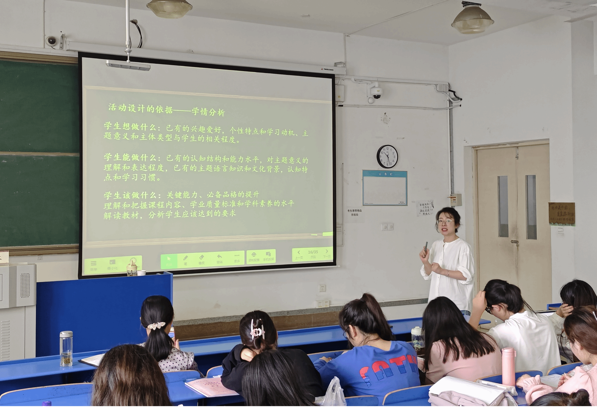 本网讯 为进一步提升小学教育专业师范生的英语教学能力,提高员工未来岗位胜任力,9月28日上午,tyc8722太阳集团邀请合肥市育新小学英语教研组组长曹敏在逸夫楼A201教室开展小学英语教学能力提升交流活动,活动由唐银主任主持。2021级小学教育专业全体员工参加了此次活动。