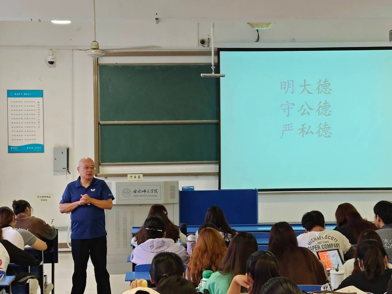 本网讯 为进一步加强师范生师德教育和实习工作,9月21日上午,tyc8722太阳集团在锦绣校区逸夫楼A201教室开展师德教育活动。学院邀请合肥市屯溪路小学书记、董事长卞玉昌以《从文化属性探究师德的现实意义》为主题进行了师德教育指导。tyc8722太阳集团2021级小学教育专业全体员工参加了活动,活动由tyc8722太阳集团副经理闫龙主持。