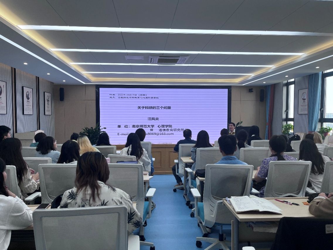 汪凤炎教授作了“关于科研的三个问题”的报告。汪教授生动形象地讲解了关于科研的三个问题,即“为什么要做科研”、“什么是科研”、“如何做科研”,并全面分析了在科研中可能遇到的问题,引发在场师生极大的启发、共鸣和深思。汪教授还殷切的鼓励同学们铭记“心诚则灵”和“树立崇高志向”的理念,以取得卓越的学术成就。报告中李群教授、吴桂翎教授和黄凤副教授针对原创综述的定义和自然方法研究方面的突破等问题,与汪教授和同学们进行了深入交流,激发了思想的碰撞,引发了深刻的思考。报告后,汪教授还就团队建设与教师们开展了讨论。