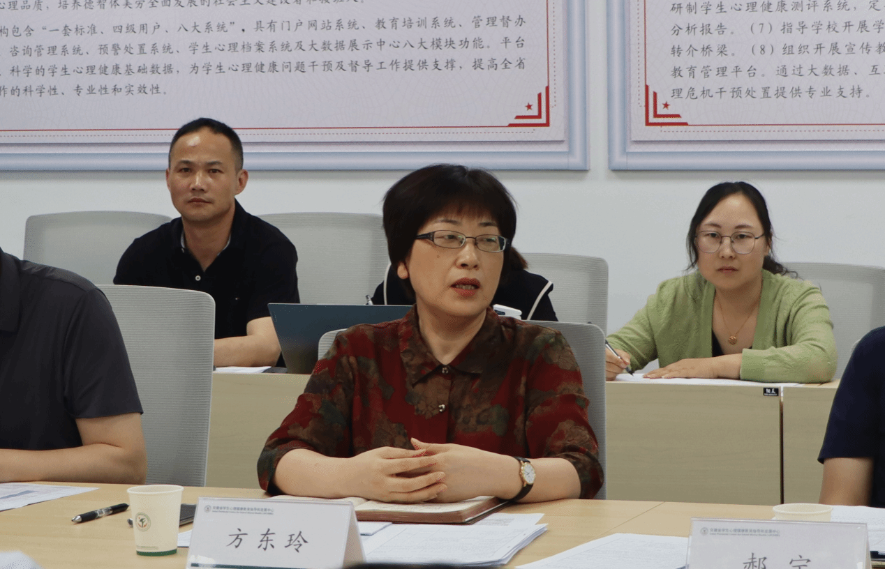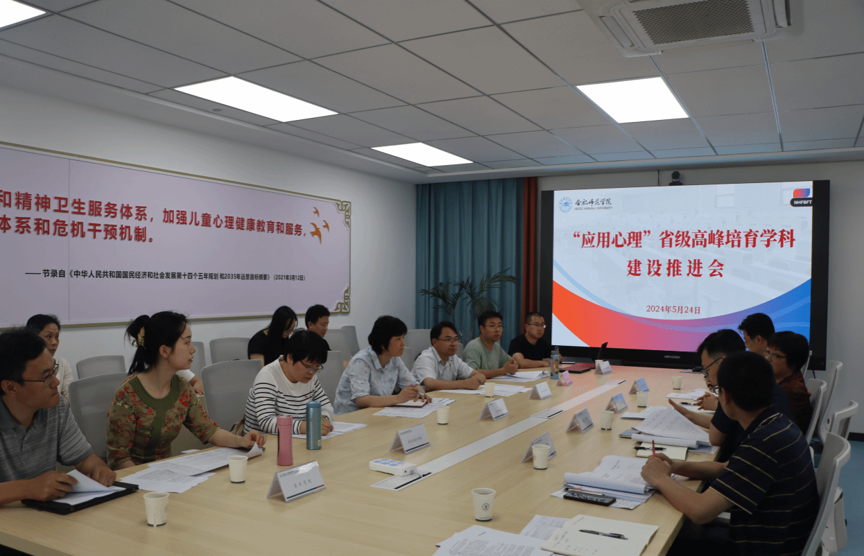 tyc8722太阳集团胡哲副经理汇报“应用心理”团队建设和学位点申报准备情况;心理系主任黄凤介绍安徽省员工心理健康教育管理平台建设基本情况;发展规划处处长李大创和研究生处处长董华泽针对团队建设和硕士点建设分别进行政策解读与指导。