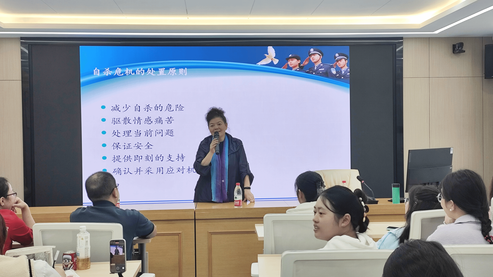 葛杨围绕心理危机谈判的定义与特点、危机谈判实战运用技术和策略、危机事件处置后的自我心理调适等方面展开讲述。她结合自己在危机谈判工作中遇到的具体案例,向大家传授使用谈判技巧化解心理危机、降低心理风险的经验和技巧,并通过启发式提问,引导大家积极思考,加深理解。
