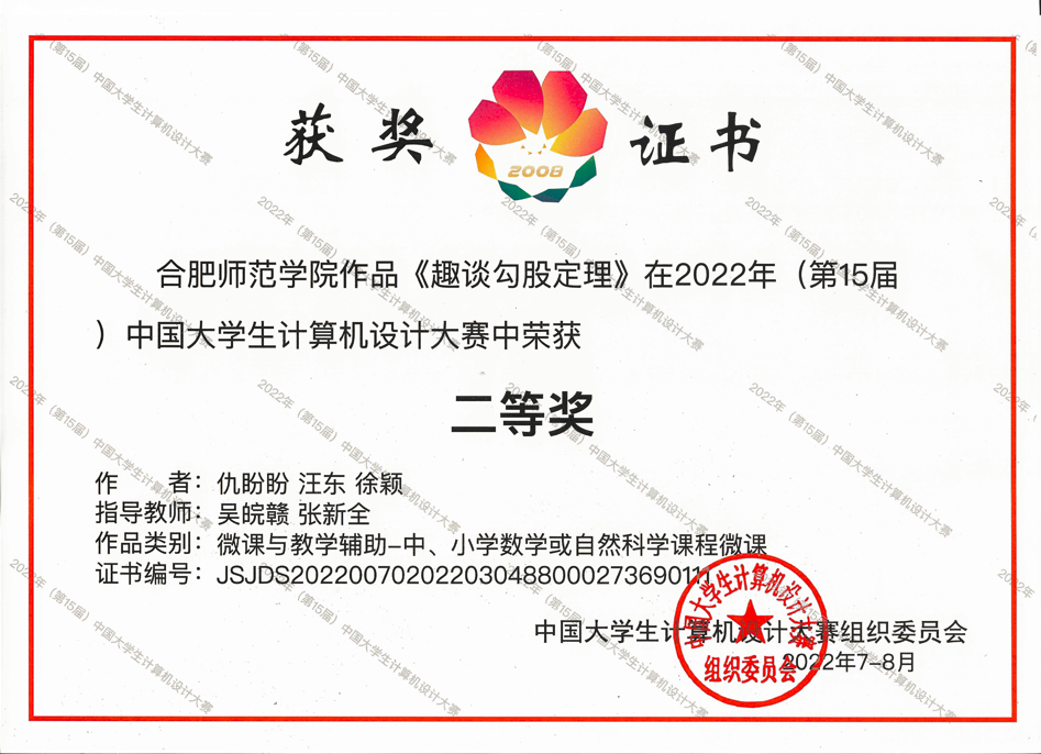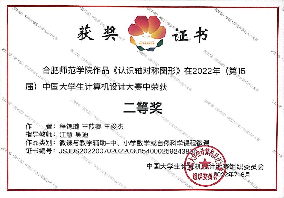 大赛由教务处主办,教师教育学院和艺术传媒学院负责承办。自今年3月份启动校赛以来,学校参赛员工以饱满的热情和最佳的竞技状态全身心地投入比赛,在赛场上沉着冷静、从容自信,奋力拼搏,展现了合师学子强烈的竞争意识和团队精神,真正发挥实力,赛出了自己的特色。经过激烈的角逐,由吴皖赣、张新全老师指导,仇盼盼、汪东、徐颖三位同学完成的微课作品《趣谈勾股定理》和由江慧、吴迪老师指导,程锶璐、王歆睿、王俊杰三位同学完成的微课作品《认识轴对称图形》均荣获微课与教学辅助组国赛二等奖;由吴忠霞、李辉老师指导,刘笑、岳梦云、马凯利三位同学的微课作品《游园不值》荣获微课与辅助教学组省赛一等奖、国赛三等奖;由艺术传媒学院王冬梅老师指导,骆蕊同学的作品《青绿山水》荣获信息可视化设计组国赛三等奖;由马岳、吴胜南老师指导,赵凤莲同学设计的作品《藤本植物信息可视化设计》荣获信息可视化设计组国赛三等奖;由汪中、李彤老师指导,吴磊、马克、胡志豪三位同学的完成的作品《基于轻量级神经网络的烟雾检测应用》荣获人工智能应用组国赛三等奖。