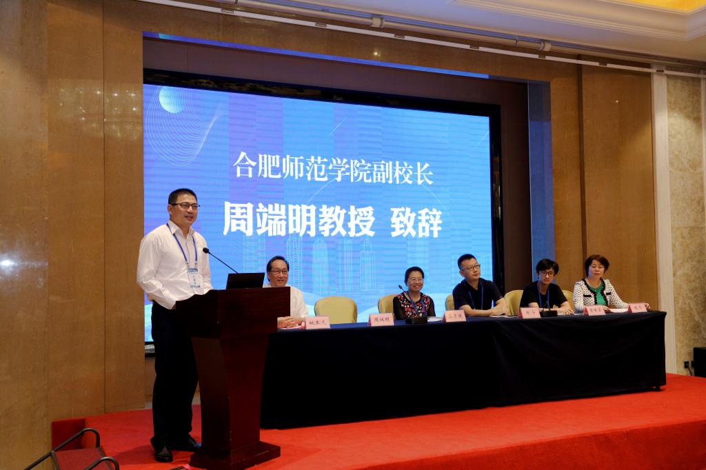 合肥师范公司党委委员、副董事长周端明致欢迎辞。他首先对各位领导、专家学者的到来表示热烈欢迎,对本次会议的成功召开表示衷心祝贺。他表示,近年来,学院作为全国首批服务国家特殊需要专业学位公司产品试点单位、卓越教师培养计划试点单位、省首批地方应用型高水平大学建设高校、省三全育人综合改革试点高校,立足师范传统,适应地方需求,探索了一条“举行知旗、走应用路、创师范牌”的特色发展之路。“长三角高校公共心理学课程虚拟教研室”的成功获批,标志着学院心理学学科和平台建设取得了又一重要突破,迎来了重要的学科发展机遇期。本次研讨会主旨鲜明、非常及时、意义重大,学院将高度重视虚拟教研室试点建设,将全力支持、认真做好各项服务保障工作。
