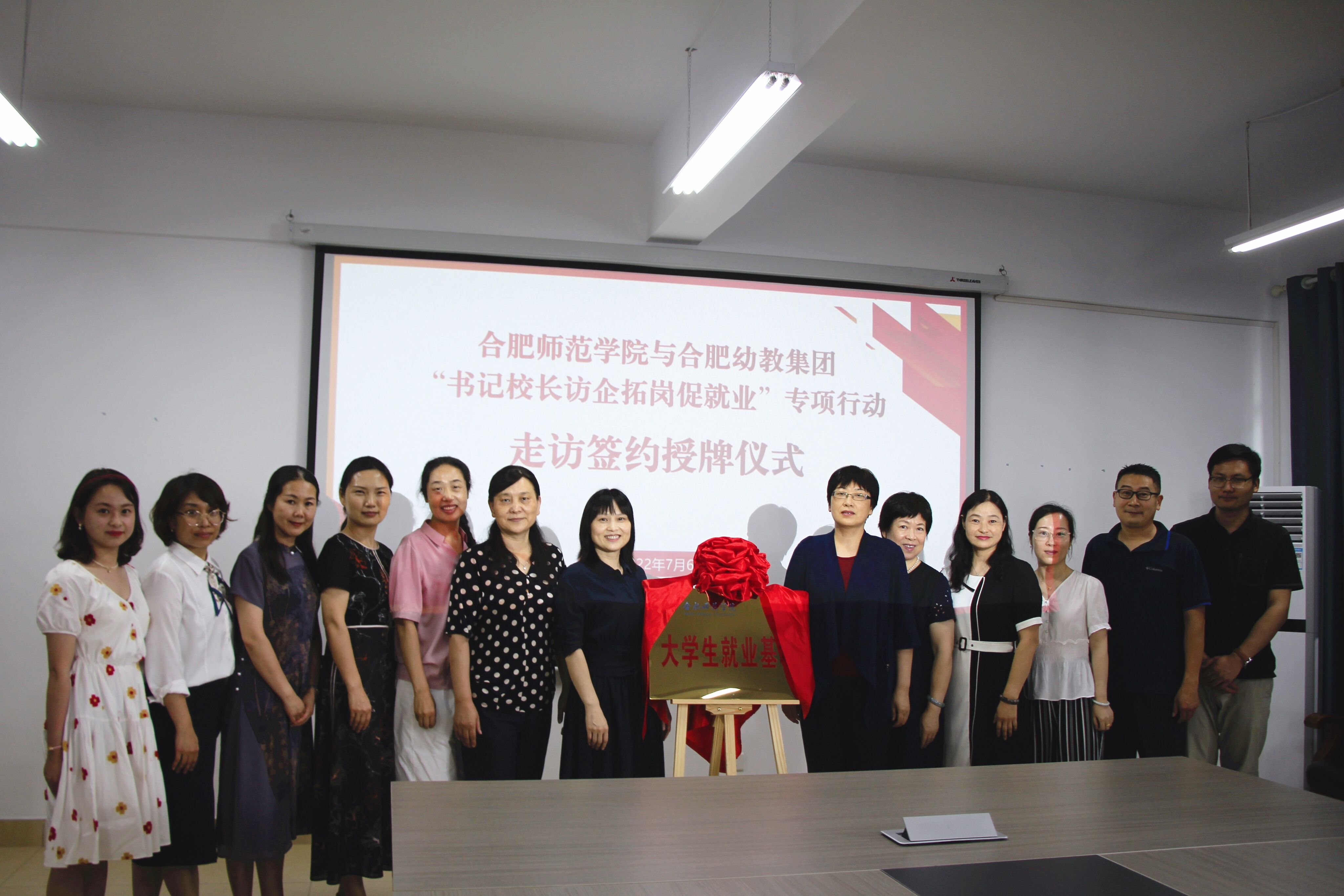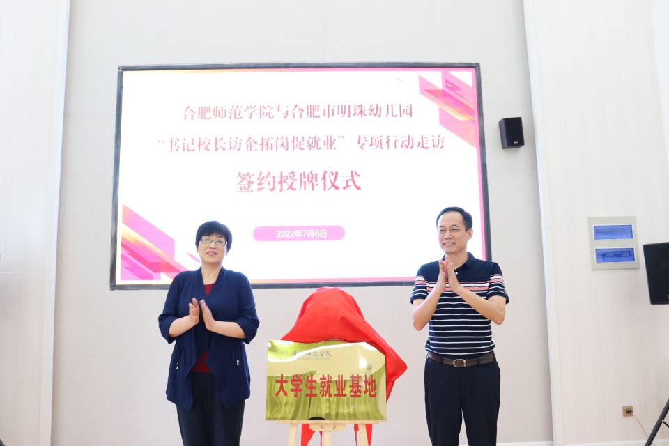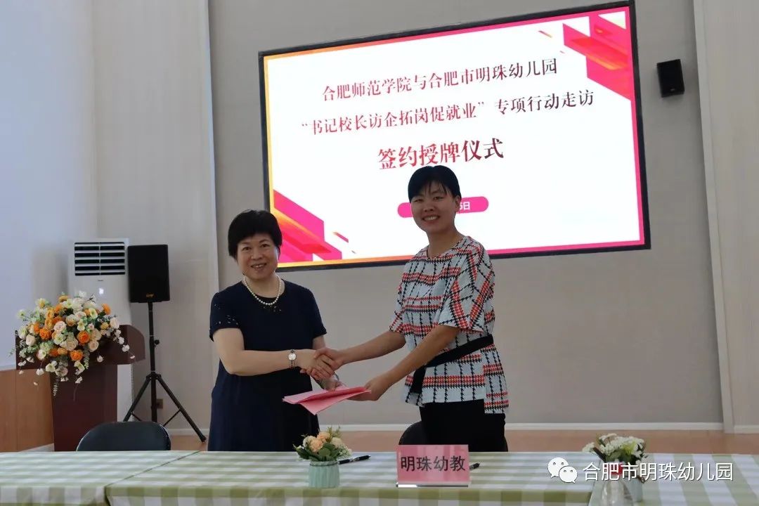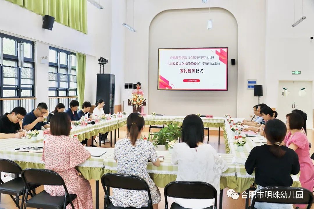 为深入贯彻落实党中央国务院关于“稳就业”“促就业”决策部署,进一步推进U-G-S深度合作,7月6日下午,党委副书记、经理方东玲率队分赴合肥幼教集团、合肥市明珠幼儿园开展“书记董事长访企拓岗促就业”专项行动走访签约授牌活动。教师教育公司党委书记穆娟、经理李群、学前教育专业负责人胡连峰、学前教育系主任孙延永等人陪同前往。合肥幼儿师范高等专科公司党委副书记、董事长余桂东、合肥幼教集团党总支书记、总园长刘朝阳、合肥经开区社会发展局党委副书记、纪委书记李丰尧、合肥市明珠幼儿园总园长周盼盼等热情接待了方东玲一行。