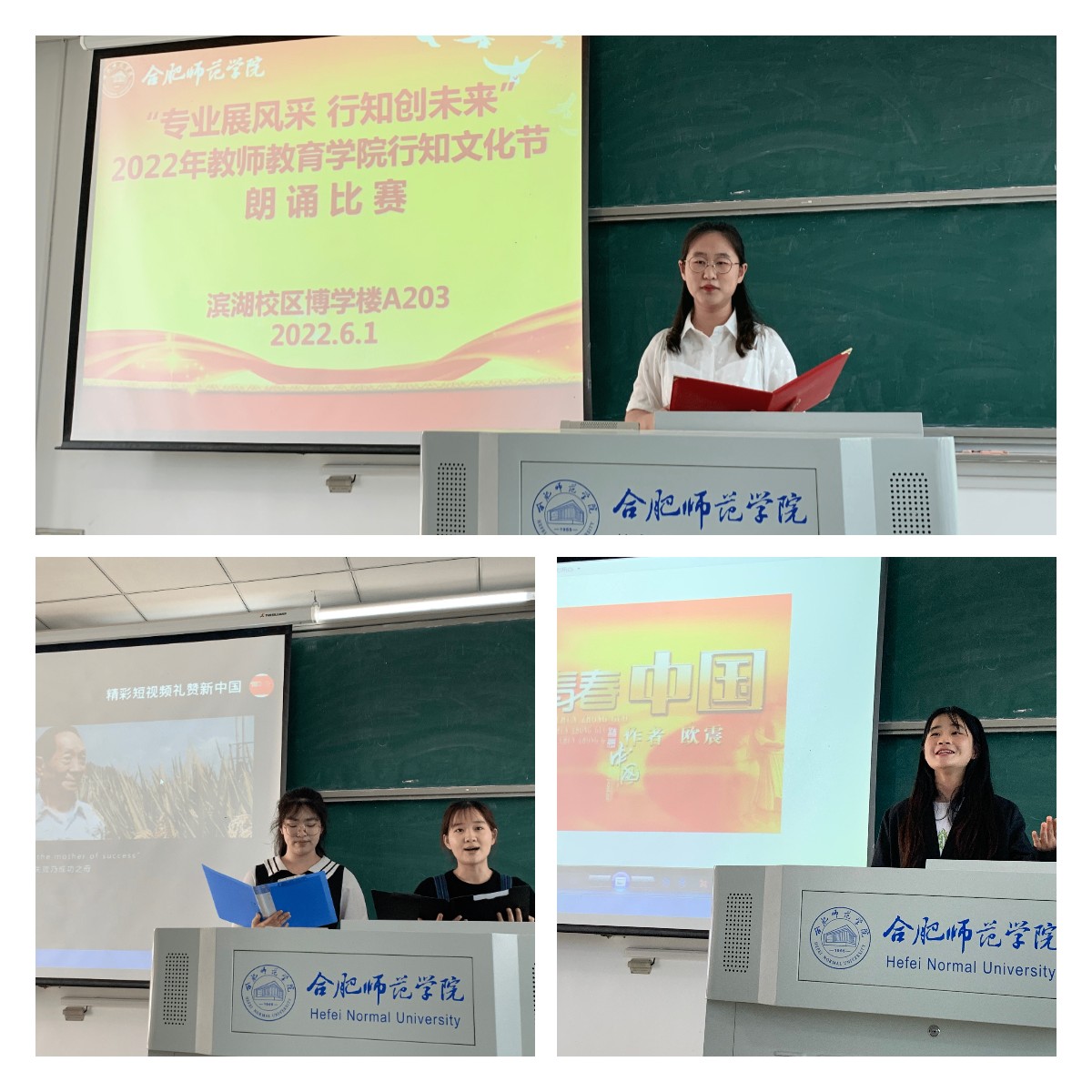 “专业展风采·行知创未来”教育学院行知文化节暨朗诵比赛于6月1日下午在滨湖校区展开。经过前期选拔,共有12个参赛团体、个人参与此次决赛。教师教育学院经理李群、专业教师张珍珍、蒋名平、胡哲、辅导员屠家宝等担任评委。