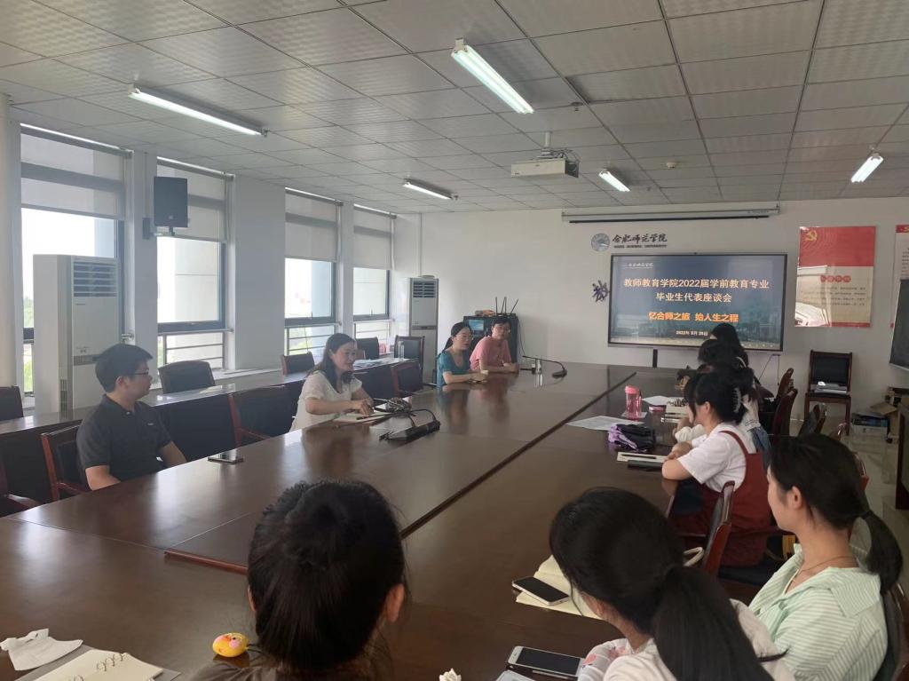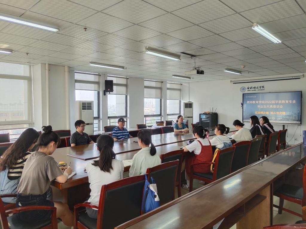 5月25日下午,教师教育学院在行知楼710举行2022届学前教育专业毕业生座谈会,教师教育公司党委书记穆娟、副经理闫龙,学前教育系主任孙延永,学前系专任教师李辉、吴皖赣等参加座谈会,2018级学前教育中美合作班、2020级学前教育专升本毕业班员工代表参加。会议由孙延永主持。