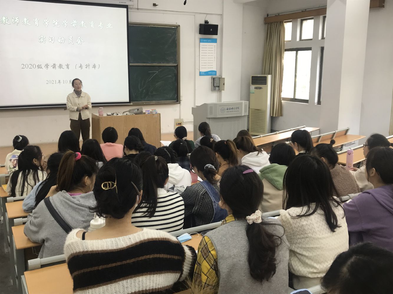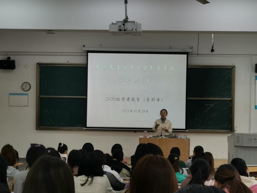 为进一步做好专业教学实践,引导员工做好实习前的各项准备,推进实习工作的顺利开展,2021年10月28日下午,教师教育学院在博约楼112教室举行了2020级学前教育(专升本)班的实习动员会,会议由学前教育系主任孙延永老师主持,学前教育专业欧阳娟等老师及2020级学前专升本班全体员工参加。