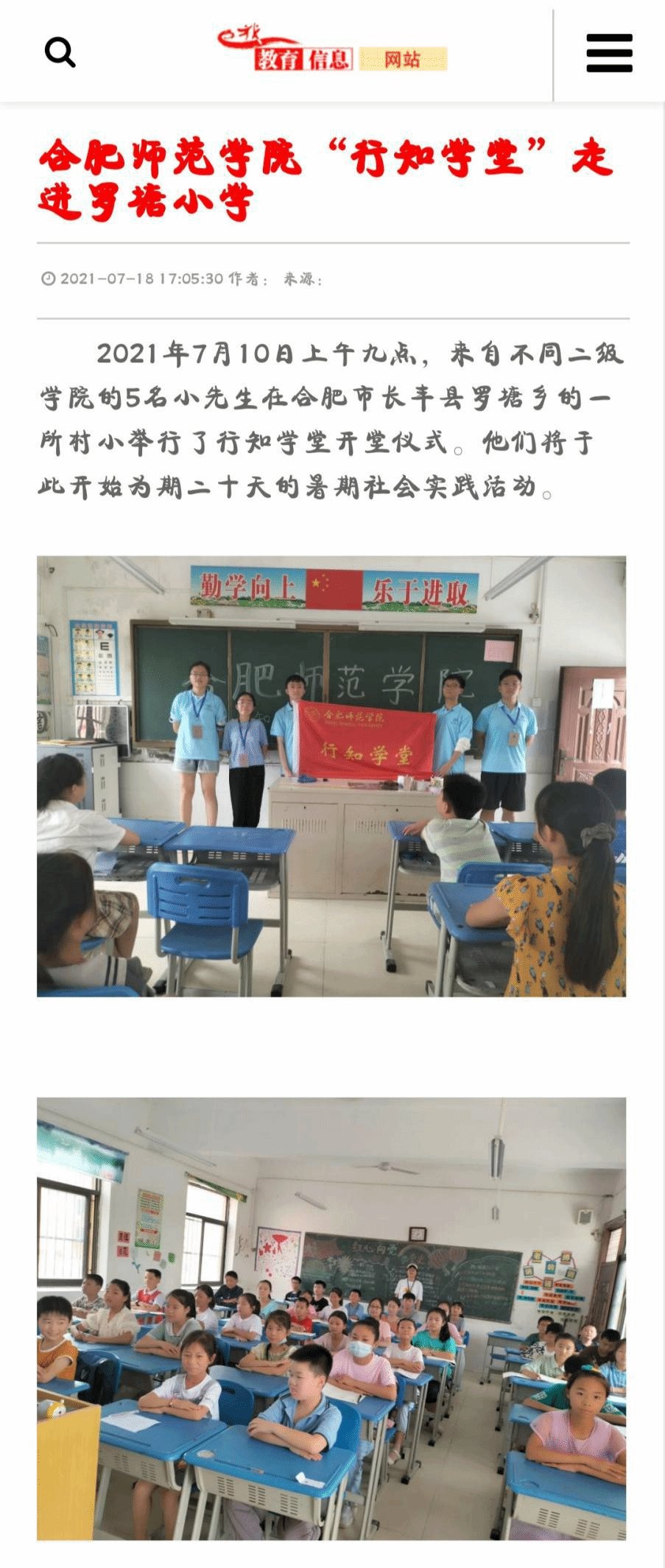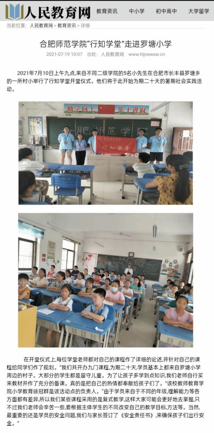7月10日,教师教育学院“罗塘小学行知学堂”在合肥市长丰县罗塘小学顺利开班,小先生团队由公司教师教育学院、经济管理学院学院以及电子与信息工程学院共5名小先生组成。课程内容包括红色教育、安全教育、行知文化、扶志课程等。