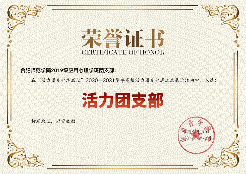 近期,由共青团中央指导、中国青年报主办的“2020-2021学年高校活力团支部”遴选工作公布了全国高校“活力团支部”获奖名单,教师教育学院2019级应用心理学班团支部在全国众多基层团组织中脱颖而出,荣获2020-2021学年高校“活力团支部”荣誉称号。