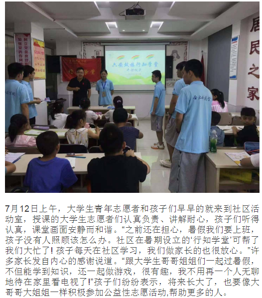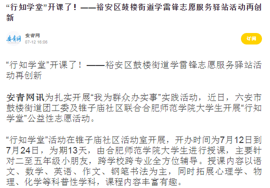 (本网讯)7月12日,教师教育学院“六安鼓楼行知学堂”在六安市鼓楼街道锥子庙社区顺利开班,小先生团队由公司教师教育学院、物理与材料工程学院以及安徽外国语学院、安徽新闻出版学院共8名小先生组成。课程内容包括党史学习、书法教学、心理辅导、素质拓展等。