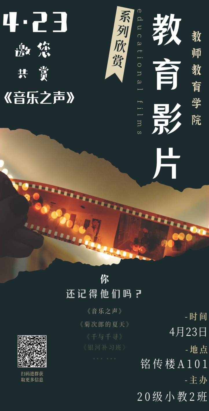 4月23日晚,2020级小学教育2班在滨湖校区铭传楼A101组织实施了首次教育影片赏析活动。此次活动引起了同学的热烈反响,200余名同学共赏影片。
