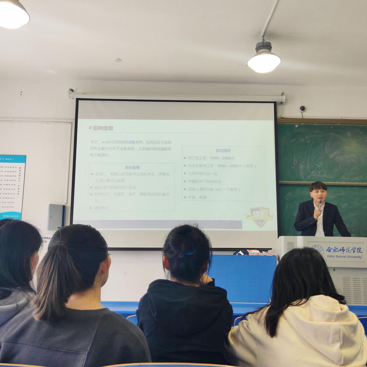 随后,宝贝德全脑教育中心、Angel Joy Academy双语幼儿园、合肥市滨湖晨星幼儿园三家单位的负责人以PPT的形式,依次向毕业生详细介绍了企业文化、招聘条件、招聘岗位、福利待遇等多方面内容。宣讲之后,企业负责人与在场的毕业生们积极互动,详细解答同学们的疑问,现场气氛热烈。此次招聘,三家公司提供早教老师、托育老师、课程顾问和市场专员等岗位需求60多人,约有30多名同学有应聘意向。