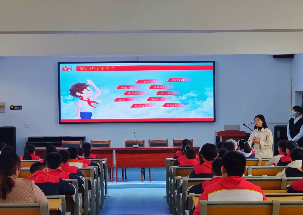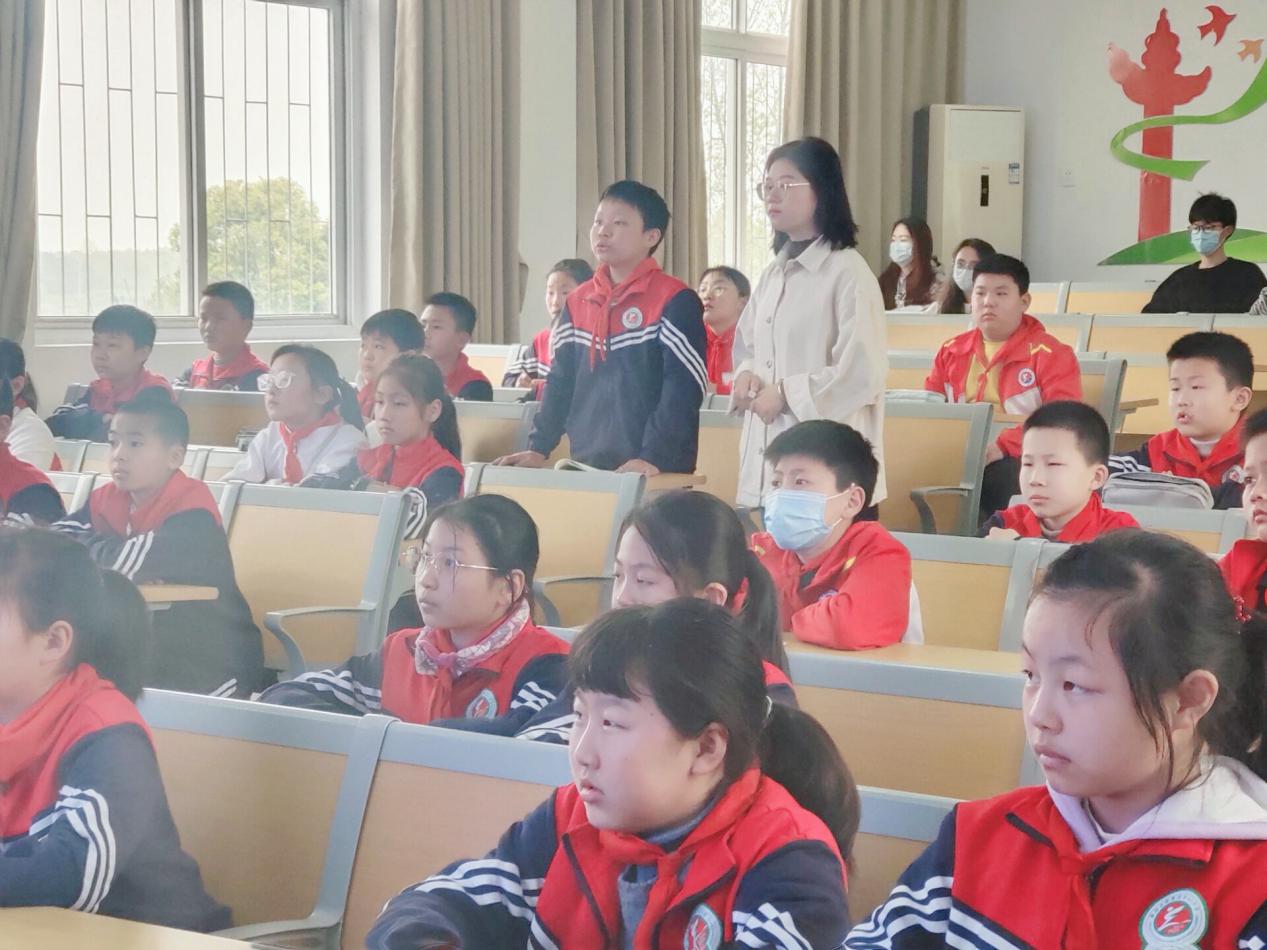 本次党史教育宣讲活动面向黄麓镇小学五年级员工。当志愿者们到达小学阶梯教室时,黄麓小学德育处主任唐永梅、班主任吴老师和全体同学们也已经到达了活动地点。本次党史教育宣讲活动主要分为三个板块进行,一是“学史明理——党的百年光辉历程”,二是“清明缅怀先烈,致敬伟大英雄”,三是“永远跟党走,新时代少年勇担当”。活动现场,秩序井然,伴随着音乐和PPT的播放,教师教育学院2019级小学教育2班邱楚楚同学向与会的少先队员们介绍了党的百年历程光辉,一张张史实记录材料、一段段光辉岁月在孩子们面前缓慢切换,深深印刻在孩子们的心里。在第二板块中,主讲人讲述了大义凛然向闸刀的刘胡兰、两弹一星元勋邓稼先、程开甲、全心全意为人民服务的雷锋同志等光荣事迹,同学们的心中涌满了对党的感恩和对英雄先烈的缅怀。活动中,志愿者们带领同学一起唱起少先队队歌《我们是共产主义接班人》,同学们的歌声稚嫩却嘹亮,也感染了全体志愿者。随后的交流发言中,少先队员们纷纷表示今后要从身边的小事做起,好好学习科学文化知识,永远跟党走,从前辈手中接下担子,努力做合格的社会主义的接班人。
