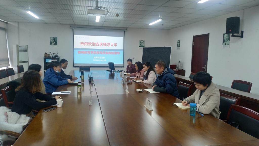 2020年11月25日上午,安庆师范大学教师教育公司党委副书记许世平、小学教育专业负责人李义胜、小学教育专业王爱菊教授和赵雪微老师,深入学校教师教育学院调研指导小学教育专业建设等问题,会议在锦绣校区行知楼710会议室召开。教师教育学院经理李群、书记穆娟、副经理闫龙、小学教育系系主任汪昌华及小学教育系部分教师参加了会议,会议由教师教育学院副经理闫龙主持。