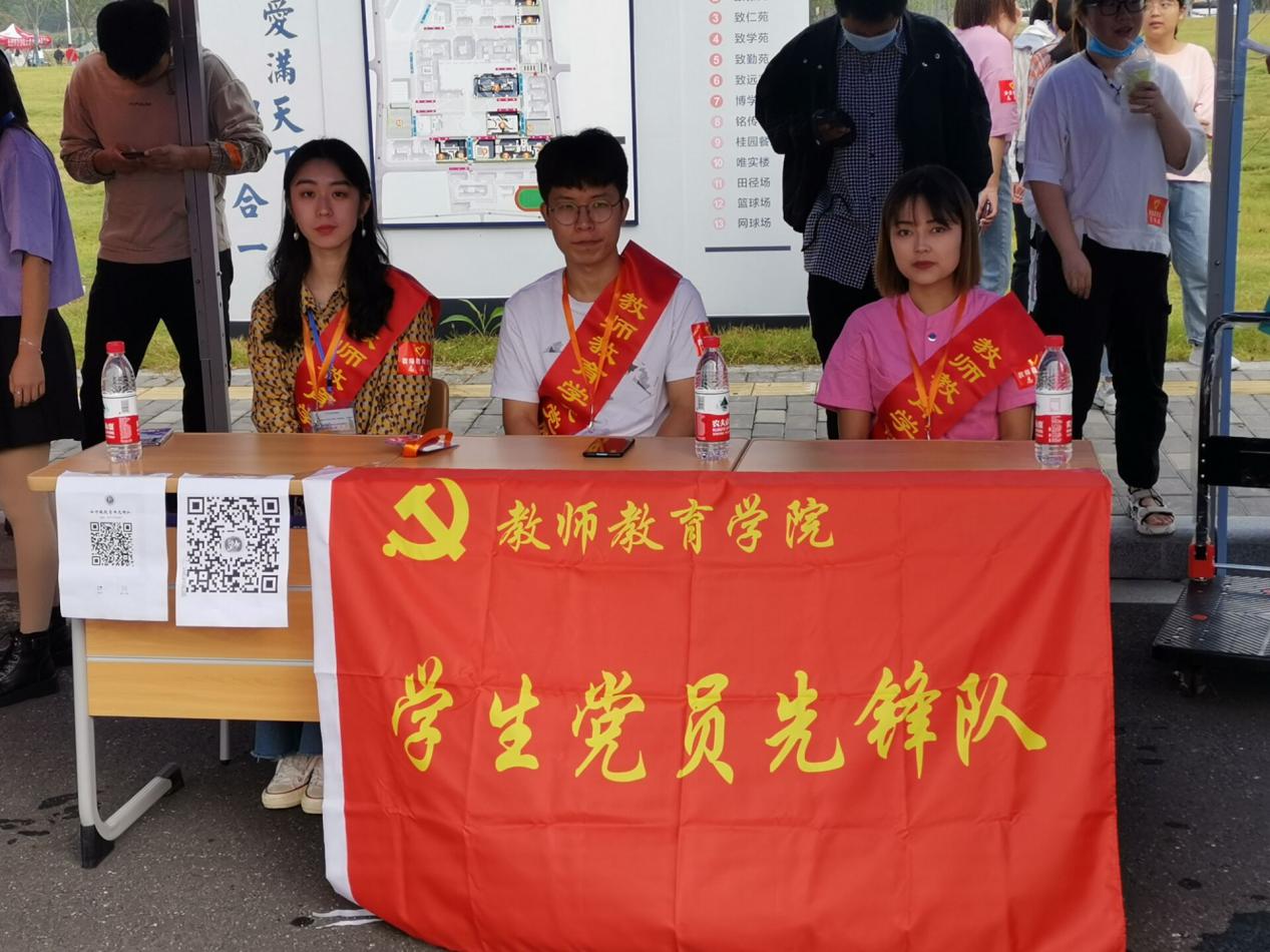 进入校园的道路两侧,学院的员工党员先锋队笑容满面,为新生提供咨询服务。