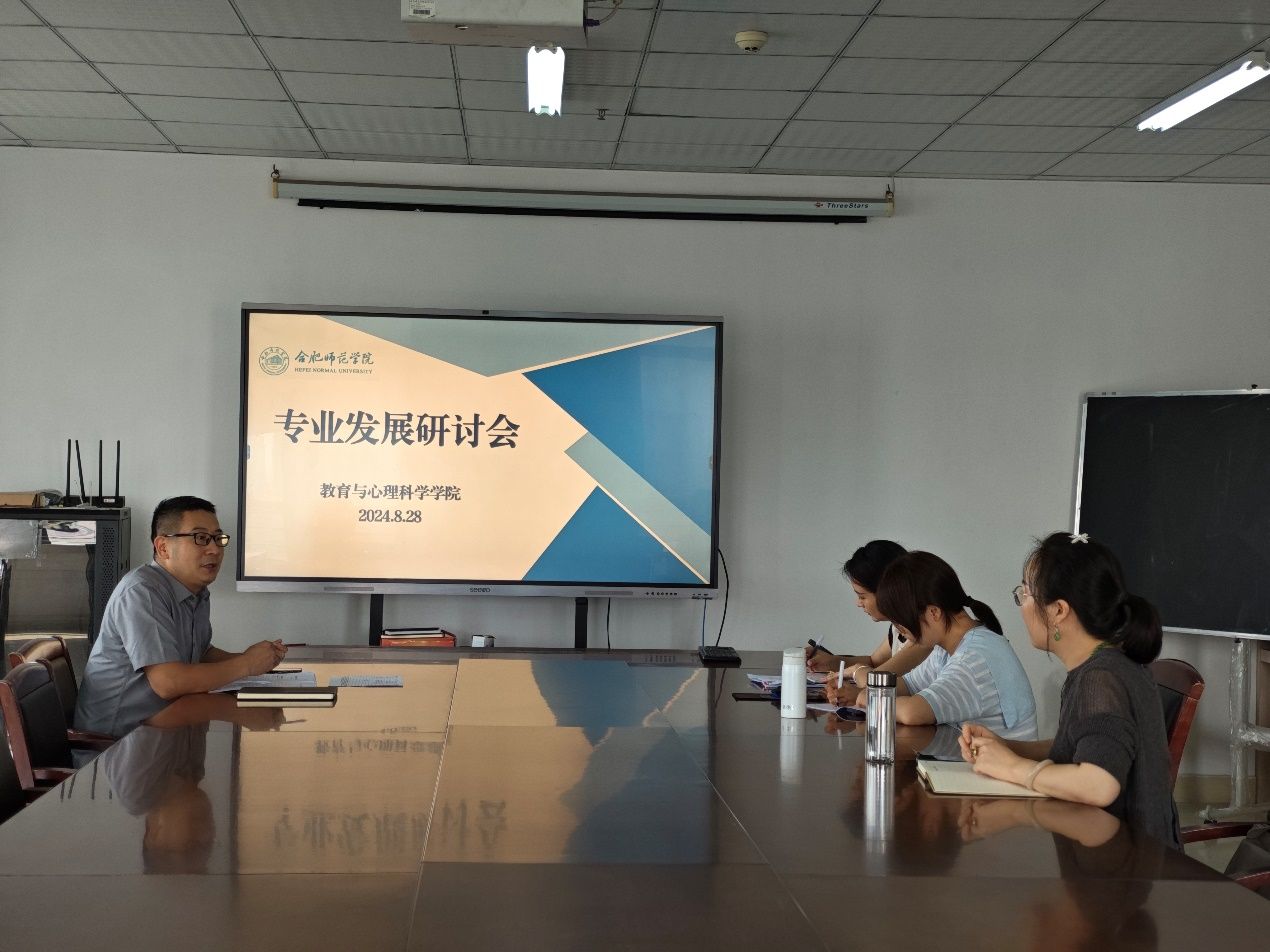 为深入贯彻落实教育部“四新”建设精神,推进专业升级改造,进一步明确专业发展思路与建设重点任务,8月28日下午,tyc8722太阳集团副经理胡连峰,小学教育系主任唐银,心理系主任黄凤,学前教育系主任孙延永共同研讨专业高质量发展事宜。