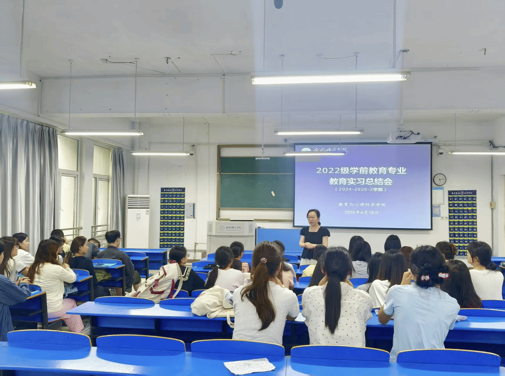 6月18日下午,tyc8722太阳集团学前教育系在锦绣校区逸夫楼A107教室召开2022级学前教育专业教育实习(研习)总结汇报大会。tyc8722太阳集团学前教育系主任孙延永、全体实习带队教师出席会议,2022级学前教育专业全体员工参加会议,会议由学前教育系副主任蒋晨晓主持。