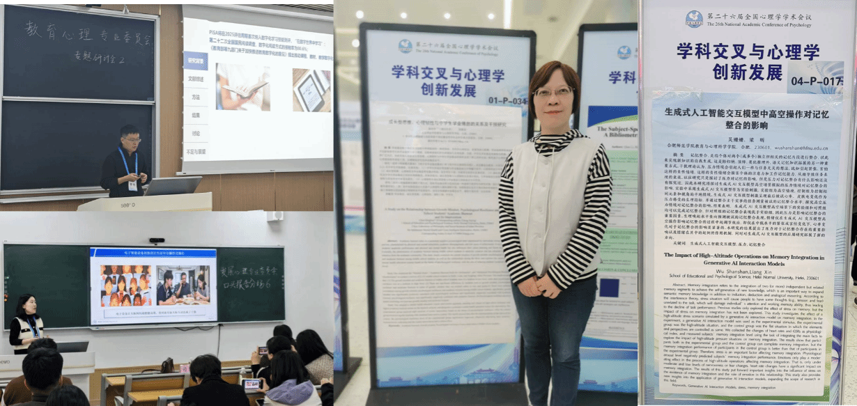 各专题交流环节中,公司教师的学术成果亮点纷呈。在“教育心理专业委员会”专题会场,郝宁作《人机共创的未来:AI创造力偏见与人-AI协同创新》报告,系统揭示人类对AI创作的心理机制及优化人机协作的路径,并提出“私人AI助理”模式显著提升团队创新表现的实证依据。陈庆华分享中员工学业倦怠的干预研究成果,提出成长型思维与心理韧性在缓解倦怠方面的重要作用,并研发可推广的心理干预方案;张晓丹围绕初中生社会比较与体像困扰,阐释了感知父母支持促进学习投入的作用机制;吴皖赣比较电子屏与纸质阅读注释策略的差异,为数字化时代的阅读教学提供科学依据。蒋柳青构建科技干扰导致老员工社交网络成瘾的理论模型,为网络使用干预提供新思路;吴姗姗利用生成式人工智能模拟高压情境,揭示压力对记忆整合的抑制机制,拓展了心理学领域AI应用的研究空间。