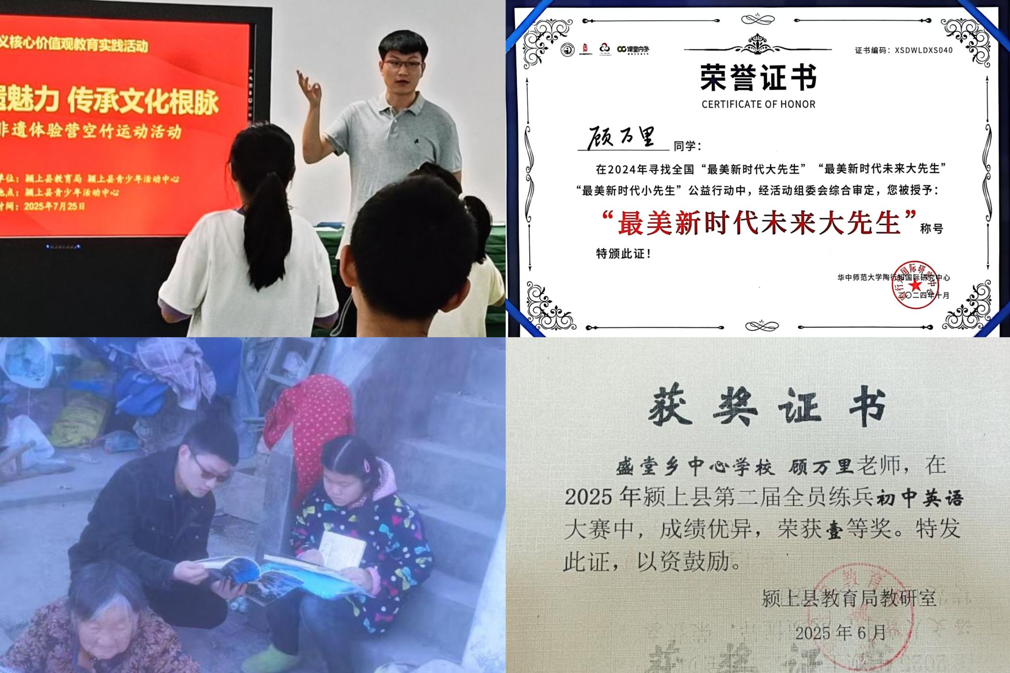 2024年,顾万里毕业后即返乡从教,除担任教学工作外还身兼数职,也被颍上县青少年活动中心聘为专业教师,在乡村学校传授抖空竹技艺。在一次顾万里送教下乡时,得知还有一些适龄残疾儿童也有学习想法却因家庭与先天性疾病等原因,无法正常进班上课,他便抽出时间去他们家中授课,并鼓励他们:“知识是你改变命运的钥匙,无论遇到多大的困难,都不能放弃,以后有事联系顾老师。”孩子们听后,泪水在眼眶里打转,其中一位叫小琪的孩子哽咽着说:“小顾老师,您是我生命中最重要的人。”
