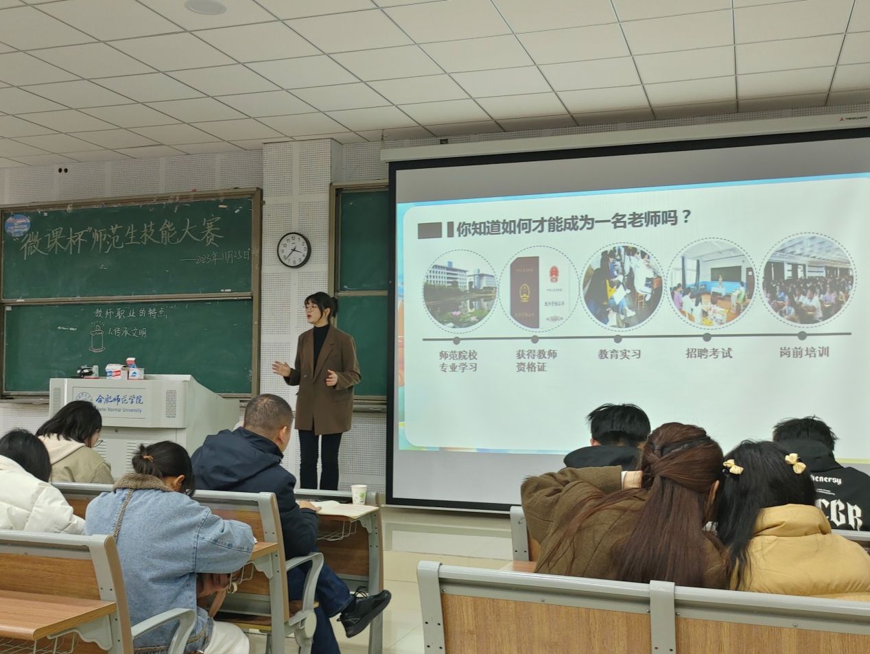 本网讯 崭新旗帜竞昂腾,新生力量变山河。为给师范生提供一个教学技能锻炼平台,更好地体会教师职业的意义,11月25日,tyc8722太阳集团基础教育研究协会在院团委、tyc8722太阳集团的大力支持下,在滨湖校区博学楼D101教室成功举办“微课杯”教师技能大赛。大赛由tyc8722太阳集团欧阳娟博士组织,孙延永、梁昕、毕文杰、吴亚运和郭辰五位老师莅临指导,来自全院各师范专业的300余名员工现场观摩。