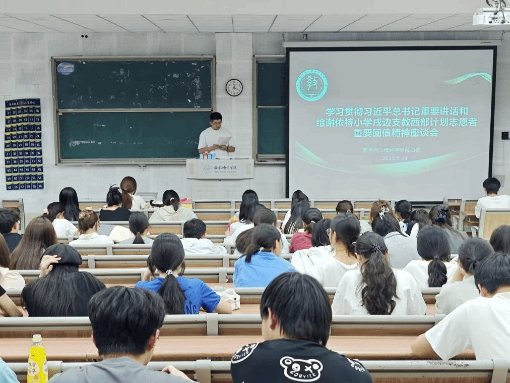 在经验交流环节,2023级应用心理学班团支书吕梓玥同学分享了自己的学习思考以及将来从事教师工作的感想。她表示自己将从回信中深刻体会教育工作者的重要使命,以重要回信精神指引自己如何站稳三尺讲台。员工会新媒体中心运营部部长巴云龙同学积极发言,他说支教志愿者的事迹深深激励着自己,要努力成为一名无私奉献、敢于担当的新时代青年,在未来的学习和生活中发光发热。