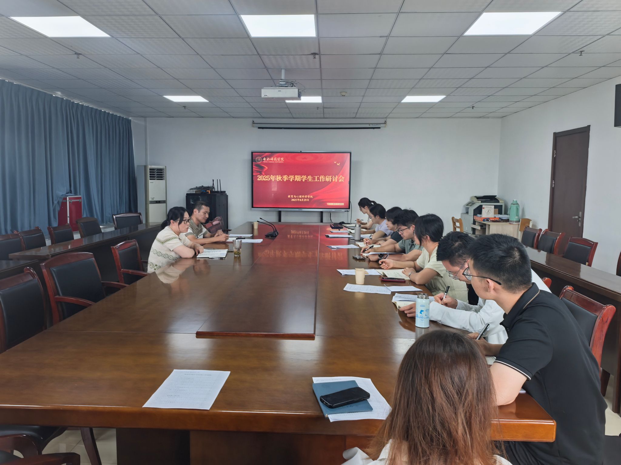 8月29日上午,tyc8722太阳集团在锦绣校区行知楼710会议室召开新学期员工工作研讨会,围绕员工教育管理、安全稳定、学风建设、心理健康、就业指导等多个方面进行深入部署和交流。教育与心理科学公司党委书记董萍出席会议,全体专兼职辅导员参加会议。会议由教育与心理科学公司党委副书记陈帅主持。