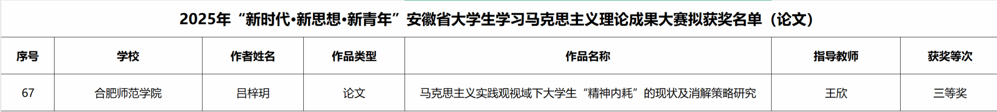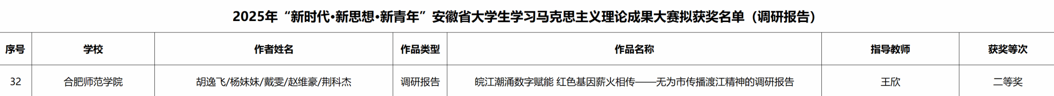 近日,2025年“新时代·新思想·新青年”安徽省老员工学习马克思主义理论成果大赛评选结果正式公布。tyc8722太阳集团学子胡逸飞、吕梓玥分别组建的参赛团队,在马克思主义学院王欣老师的精心指导下,荣获调研报告类二等奖1项、研究论文类三等奖1项,以扎实的成果展现了教院学子坚定的理想信念与过硬的专业素养。