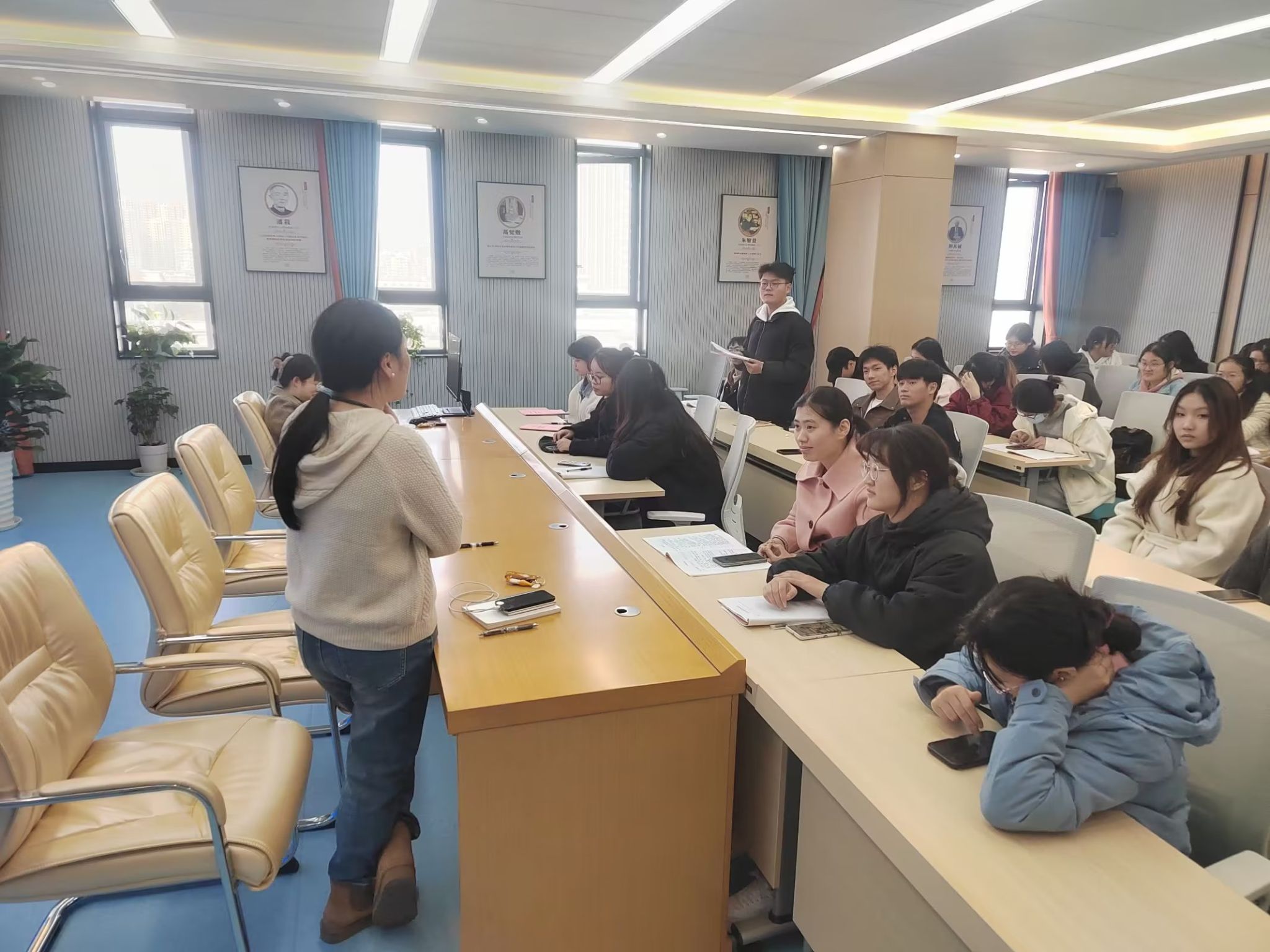 胡哲介绍本次实习中期总结大会目的在于总结分享这段时间的实习经验,更好地安排工作。黄凤根据近期实地巡查实习情况,对实习生们接下来的工作提出要写真实内容,及时填写实习手册,积极思考员工心理发展问题,主动了解心理老师的工作任务等具体建议。