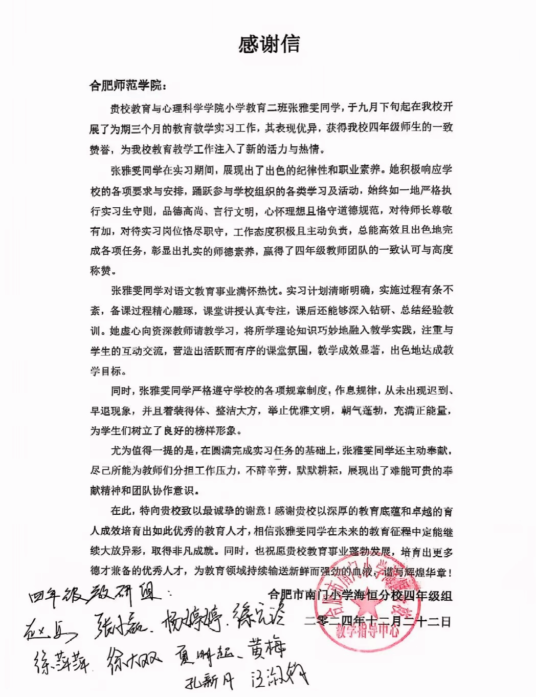 近日,tyc8722太阳集团小学教育的员工们即将圆满完成为期三个月的教育实习任务。在此期间,员工们深入教学一线,积极参与课堂教学、班级管理等工作,展现了扎实的专业素养和良好的精神风貌。其中张雅雯同学更是收到了来自合肥市南门小学海恒分校四年级组的感谢信,此事引发关注。