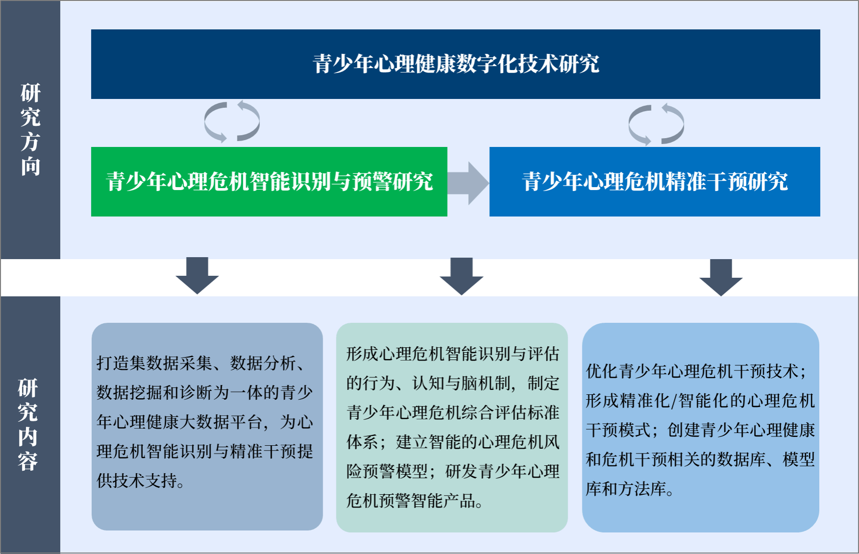 重点实验室基于健康中国发展战略,面向心理健康服务重大需求,关注青少年心理危机及干预。实验室以tyc8722太阳集团教育心理科学学院、计算机与人工智能学院、体育学院及合作单位相关力量组建团队,团队围绕青少年心理健康和危机干预,以青少年心理健康数字化技术研究、青少年心理危机智能识别与预警、青少年心理危机精准干预等方向,进行多学科交叉、多技术手段的基础研究和应用研究。
